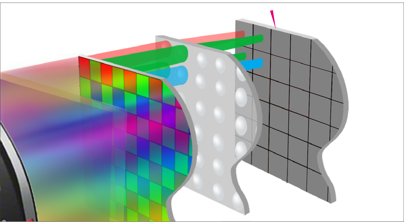 Kolejny element to mikrosoczewki, które skupiają światło. Pamiętajmy, że oglądane obrazy tej prezentacji nie oddają prawdziwej skali odległości pomiędzy elementami w matrycy aparatu, gdzie w rzeczywistości kolejne elementy praktycznie przylegają do siebie.