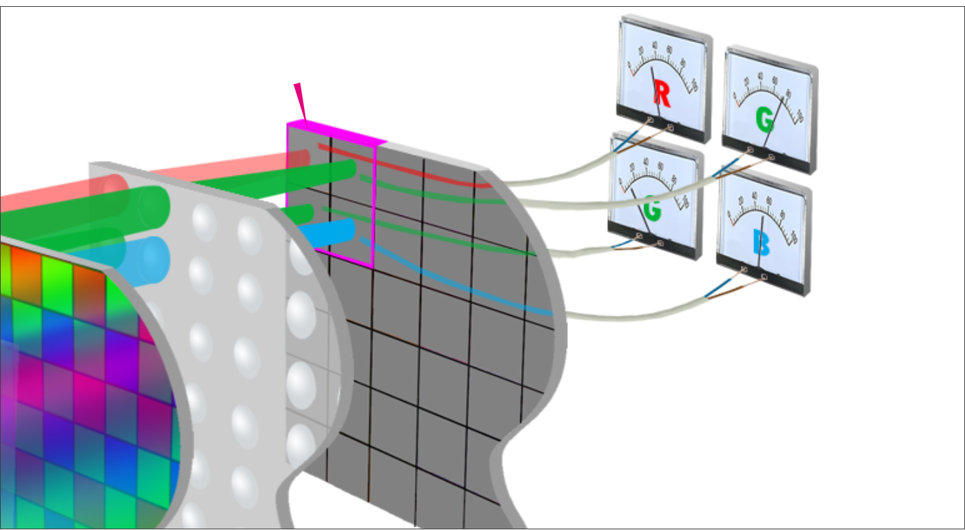 Tak, wiem! Nie ma takich kabli w matrycy aparatu! To symboliczny rysunek pokazujący, że naprawdę mierzony jest prąd wytwarzany (lub zmieniany) z każdego piksela matrycy. Symboliczne mierniki pokazują natężenie światła czerwonego, 2 razy zielonego i niebieskiego z pierwszej czwórki komórek matrycy.