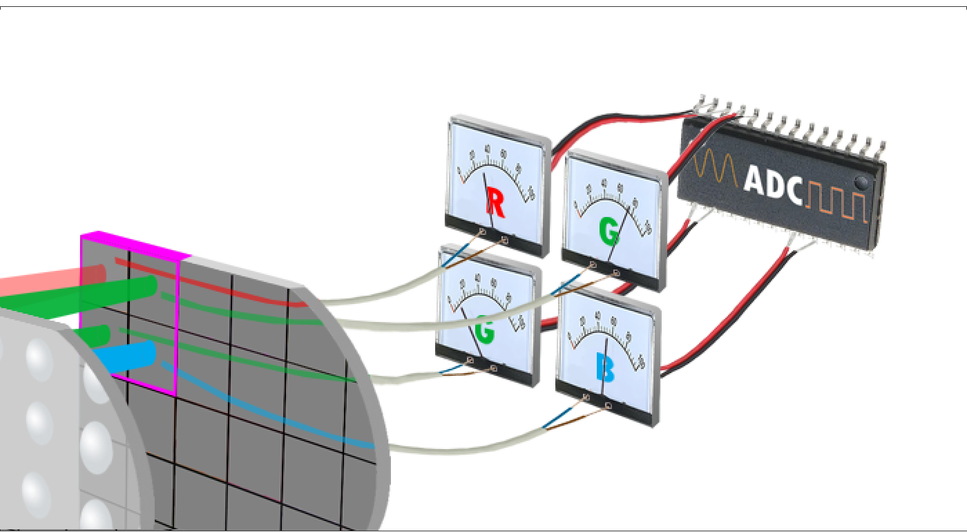 Kolejne symboliczne kable pokazują gdzie trafia sygnał elektryczny z pikseli - ADC to Analog to Digital Converter, czyli przetwornik analogowo-cyfrowy. To w nim wielkości z pomiarów przerabiane sa na liczby; np. wartości od 0 do 100 na naszych miernikach, są przez przetwornik proporcjonalnie konwertowane na liczby z zakresu od 0 do 255, co pozwala określić wartość danego koloru w systemie RGB (0 - brak koloru, 255 - pełne nasycenie danym kolorem).