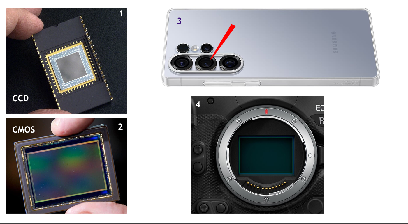Zdjęcia 1 i 2 to matryce, w tym obecnie (2025) dominująca CMOS. Zdjęcie 3 to tył jednego z telefonów mający rekordową matrycę 200 Mpx. Na zdjęciu 4 rekordowa matryca z aparatów cyfrowych - Canon i 400 Mpx.