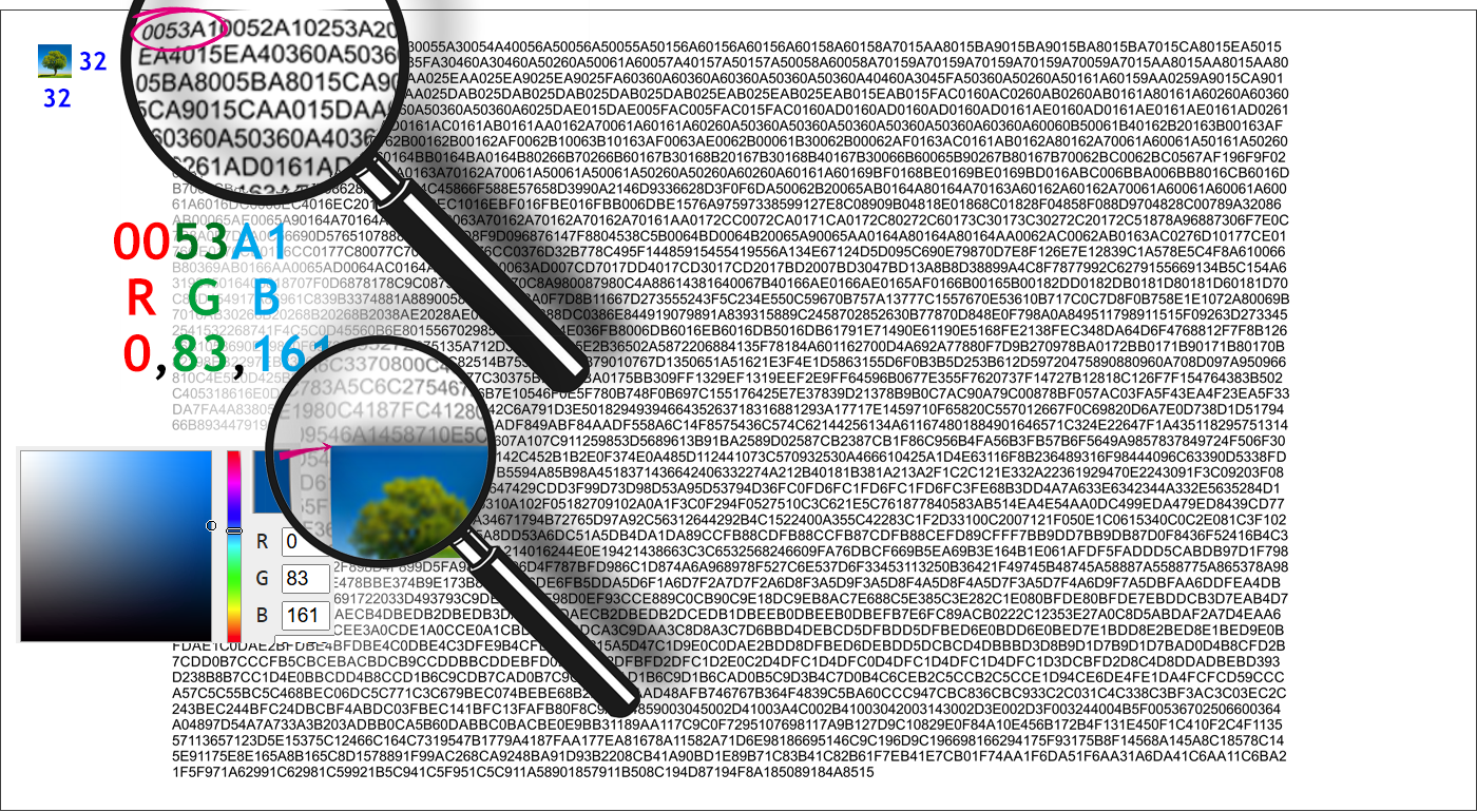 Digitalizacja obrazu na papierze. Zapis w systemie szesnastkowym malutkiego zdjęcia o wymiarach 32x32 piksele. Pierwsze znaki zapisu (0053A1) to w systemie dziesiętnym liczby 0, 83, 161, czyli w RGB jeden z odcieni niebieskiego. Taki właśnie kolor ma pierwszy piksel tego obrazu.