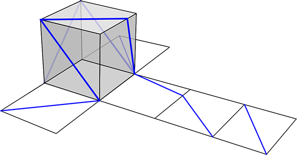 Narysuj na siatce sześcianu odcinki, które odpowiadają niebieskim odcinkom z powierzchni sześcianu.