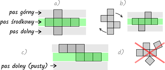 Przyjmujemy, że wszystkie nasze siatki będą ułożone poziomo (wyraźna tendencja w zadaniach matematycznych o siatkach) i będą leżeć w trzech pasach (rysunek a)).