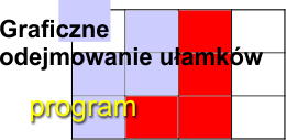 Idea graficznej interpretacji odejmowania ułamków jest taka sama jak przy dodawaniu - "całość" symbolizuje tu prostokąt, który jest dzielony na pionowe i poziome pasy, dając od razu "wspólny mianownik", czyli równe kawałki w ilości mianownik1 razy mianownik2.