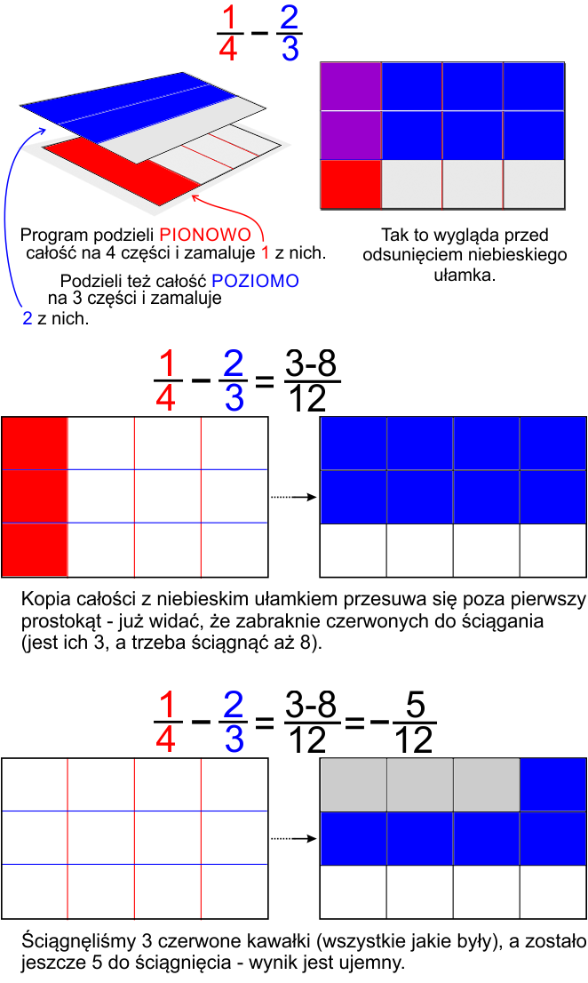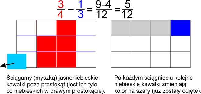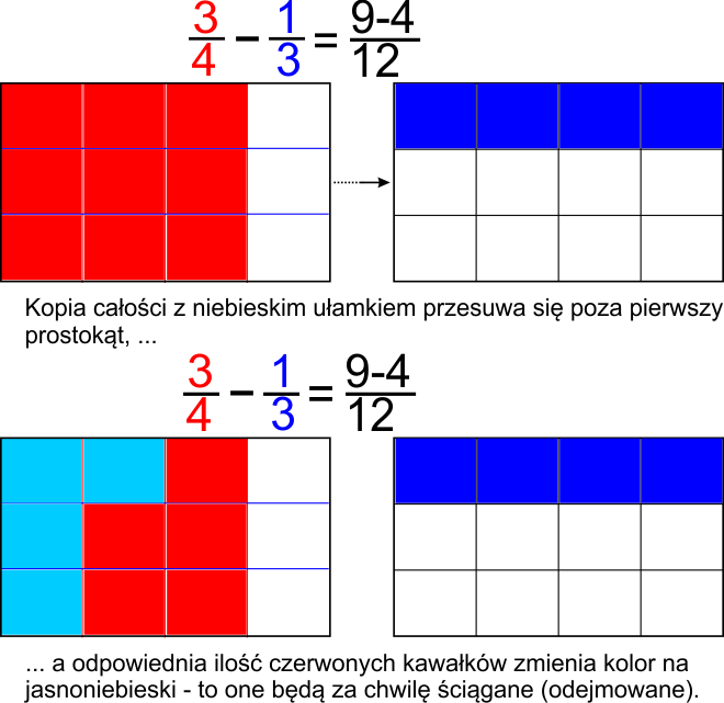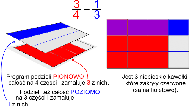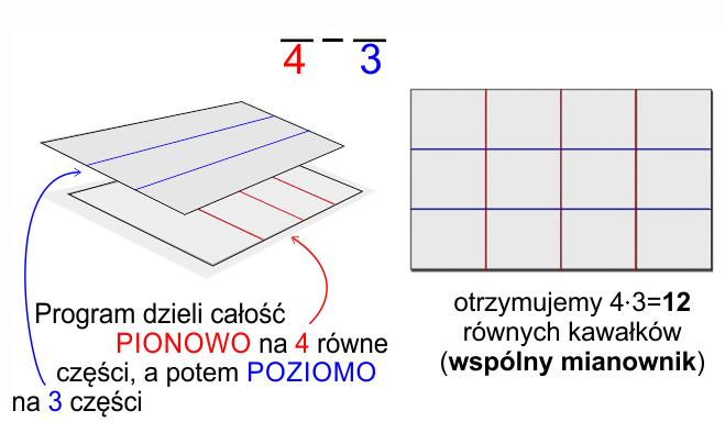 Przykład po prawej wyjaśnia to, na odejmowaniu ułamków o mianownikach 4 i 3 - najpierw pionowy podział na 4 równe części, a potem NA TYM SAMYM prostokącie, podział poziomy na 3 części. W efekcie otrzymujemy podział całości na 4x3=12 równych kawałków.