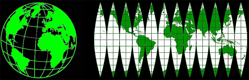 Poniżej efekt opisanej wcześniej metody tworzenia pseudosiatki kuli przez prostowanie pasków wyznaczonych przez południki, na przykładzie kuli ziemskiej.
