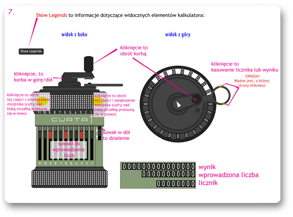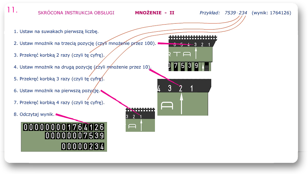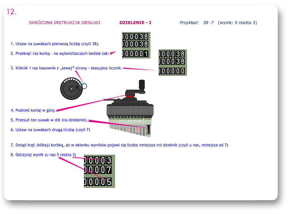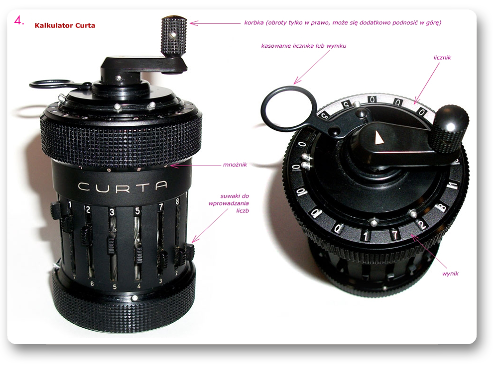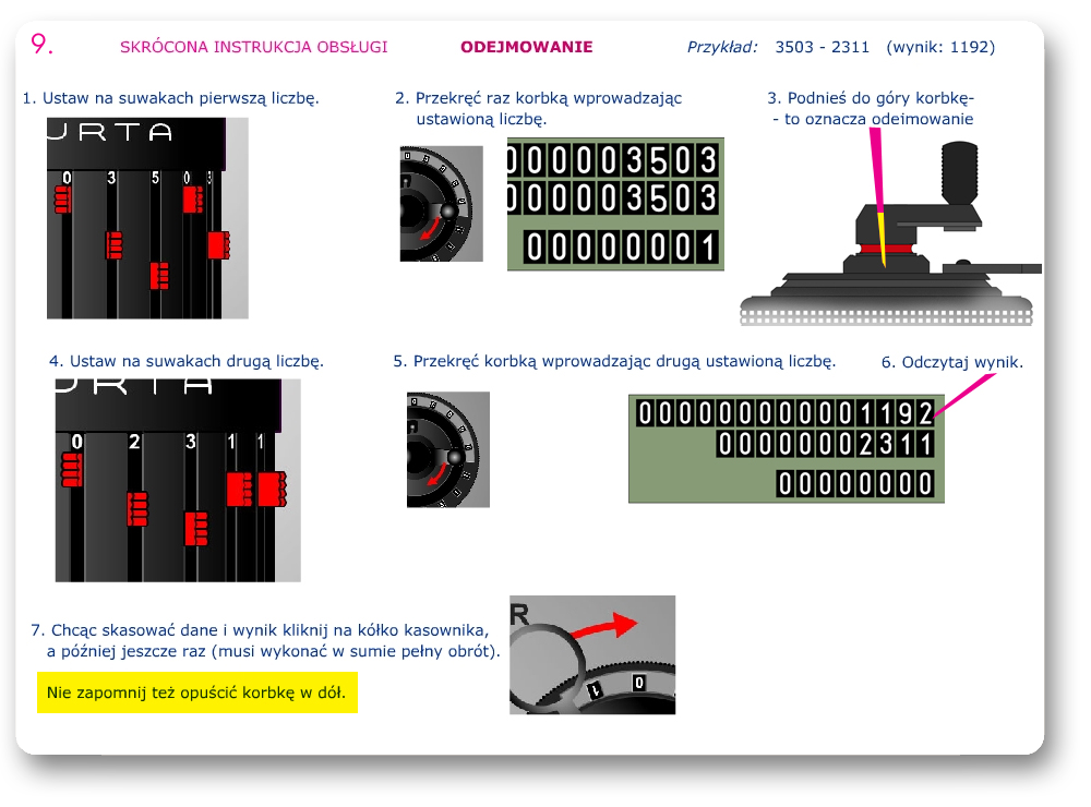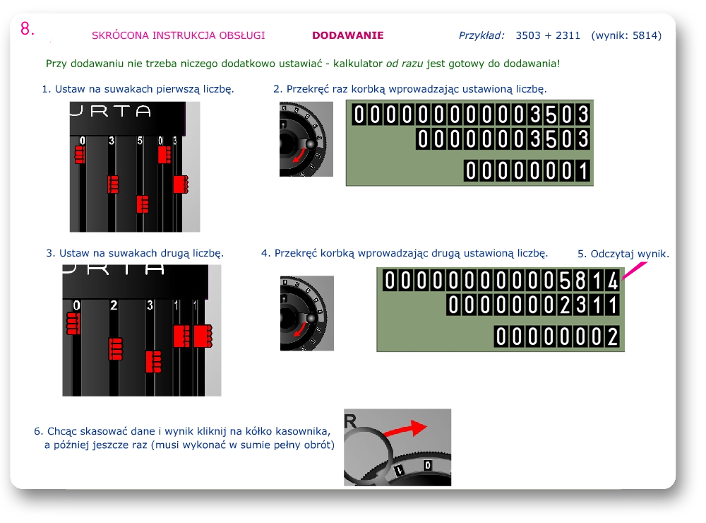 Poniżej wyjaśnienia, jak na kalkulatorze Curta wykonać podstawowe działania matematyczne.