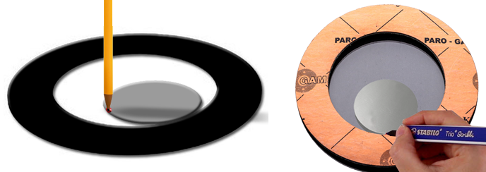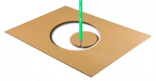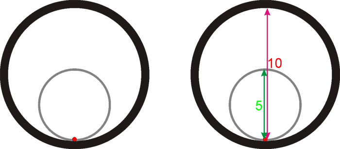 Wewnątrz dużego okręgu (pierścienia, walca) toczy się bez poślizgu koło ze światełkiem, przy czym jest o połowę mniejsze od dużego. Wyjaśnia to poniższy rysunek - jeśli duży okrąg ma 10 cm średnicy, to małe koło ma średnicę 5 cm.