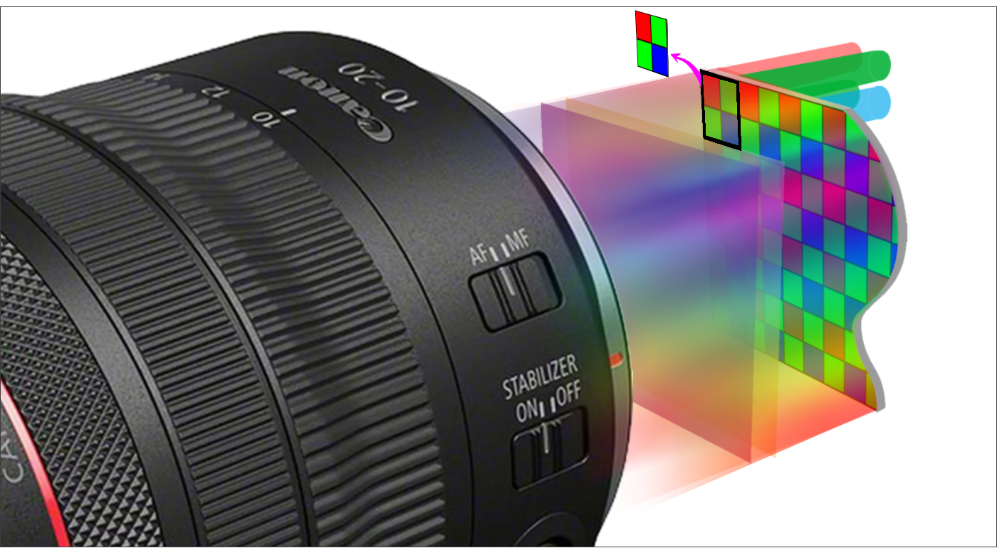 Kolejnym elementem na drodze światła jest matryca z mikrofiltrami, które przepuszczą tylko światło czerwone, zielone i niebieskie (RGB). W typowym ułożeniu, zwanym matrycą Bayera, są to powtarzające się czwórki filtrów (jeden z nich pokazany osobno), przy czym połowa jest zielona, co odpowiada budowie ludzkiego oka, w którym wprawdzie na siatkówce nie ma dwa razy więcej czopków reagujących na zieleń, ale to ich udział jest najważniejszy w widzeniu barw.