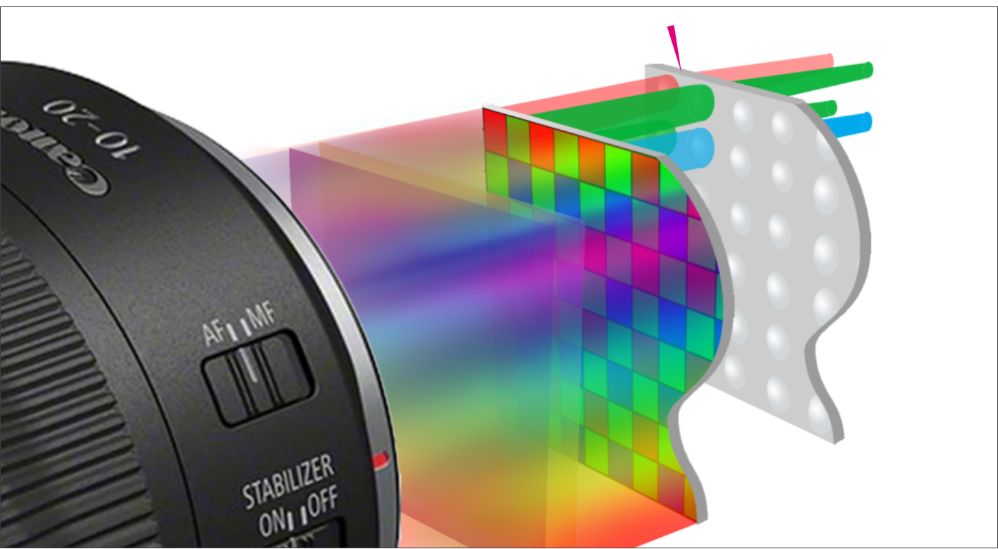 Kolejny element to mikrosoczewki, które skupiają światło. Pamiętajmy, że oglądane obrazy tej prezentacji nie oddają prawdziwej skali odległości pomiędzy elementami w matrycy aparatu, gdzie w rzeczywistości kolejne elementy praktycznie przylegają do siebie.