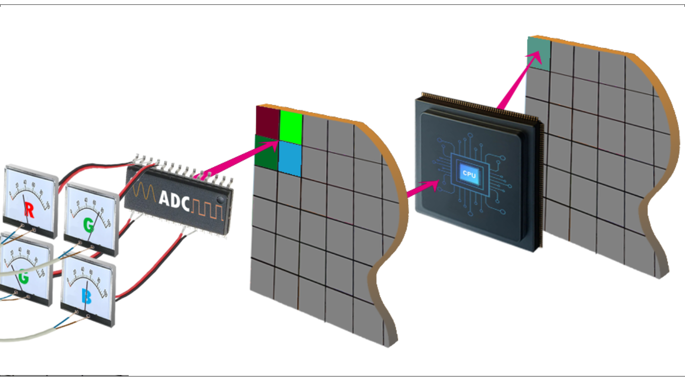 Kolejne symboliczne kable pokazują gdzie trafia sygnał elektryczny z pikseli - ADC to Analog to Digital Converter, czyli przetwornik analogowo-cyfrowy. To w nim wielkości z pomiarów przerabiane sa na liczby; np. wartości od 0 do 100 na naszych miernikach, są przez przetwornik proporcjonalnie konwertowane na liczby z zakresu od 0 do 255, co pozwala określić wartość danego koloru w systemie RGB (0 - brak koloru, 255 - pełne nasycenie danym kolorem).