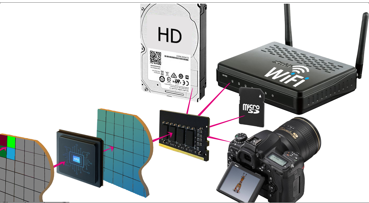 Dane o kolorach trafiają do pamięci matrycy, a stamtąd na zewnątrz, czyli np. do twadrego dysku (HD), karty pamięci (SD), wyświetlacza (aparatu lub monitora) lub sieci.