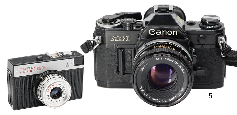 5. Przykłady aparatów z II poł. XX wieku - po lewej tani aparat dla każdego, a po prawej lustrzanka z wymiennym obiektywem i elektroniką automatycznie dobierającą parametry w czasie robienia zdjęcia.