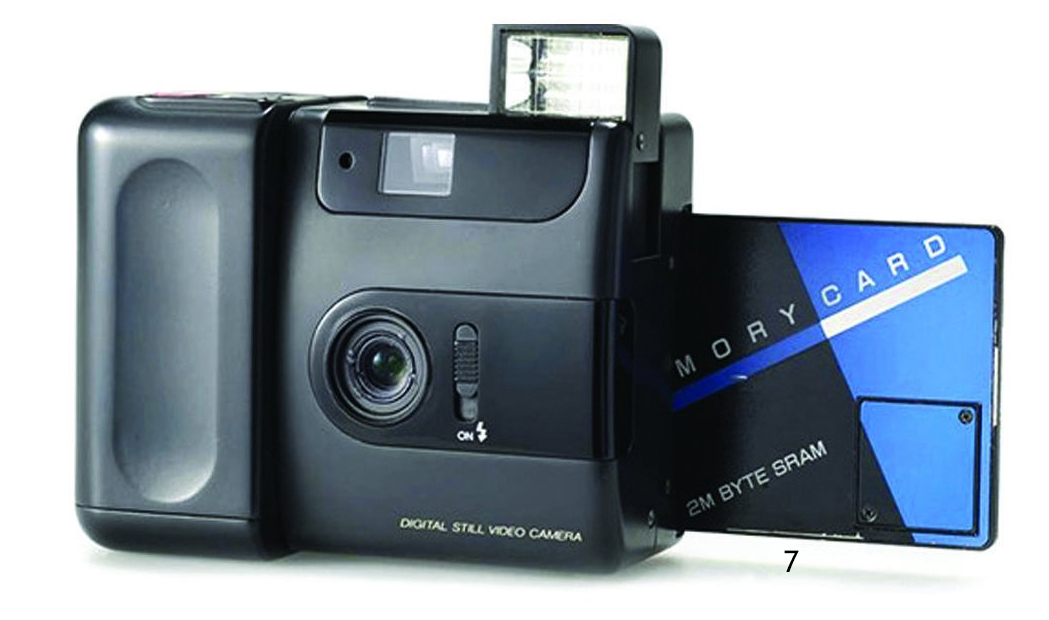 7. Pierwszy aparat cyfrowy dla użytkowników indywidualnych (FUJIX DS-1P, 1987/88). Wykorzystywał karty pamięci 2 MB do przechowywania danych.