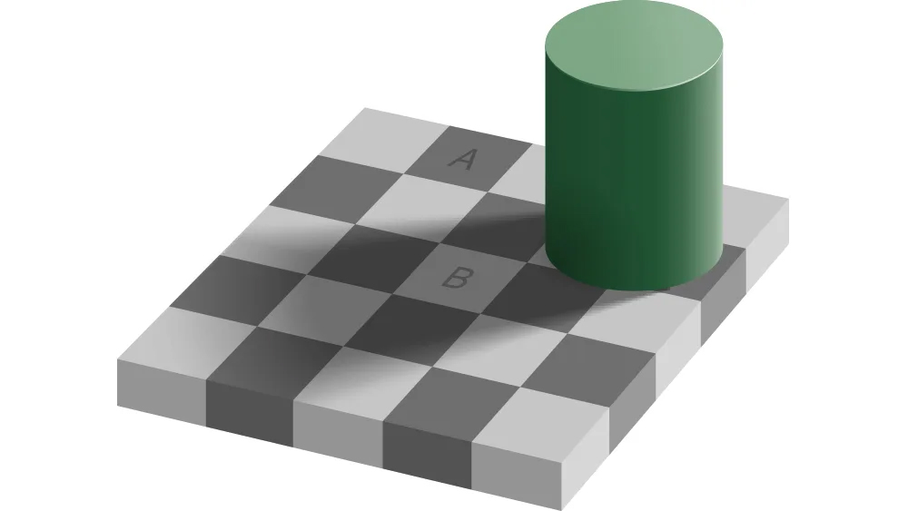 Ćwiczenie oparte na jednej z najbardziej zdumiewających iluzji stworzonych w 1995 roku przez Edwarda Adelsona. Na widocznej obok grafice są kwadraty oznaczone A i B i chociaż wydaje się to absolutnie niemożliwe, to mają w rzeczywistości ten sam kolor! Nie ma chyba człowieka, który by w to za pierwszym razem uwierzył, a i później, znając prawdę i tak wydaje się to niemożliwe.