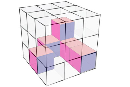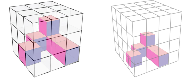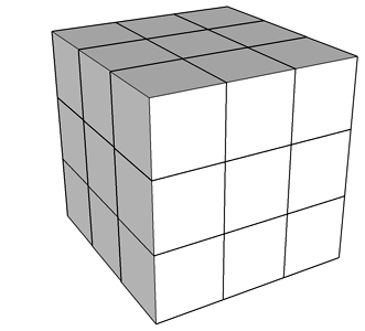 Rysunek pokazuje cały sześcian, który uzupełni naszą konstrukcję - ma wymiary 3x3x3, wieć składa się z 27 klocków.