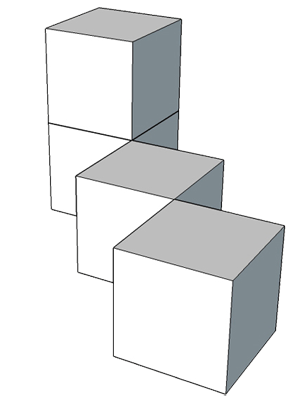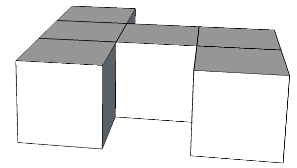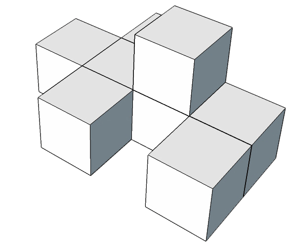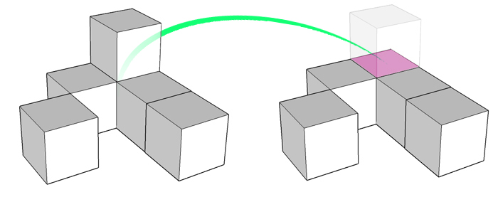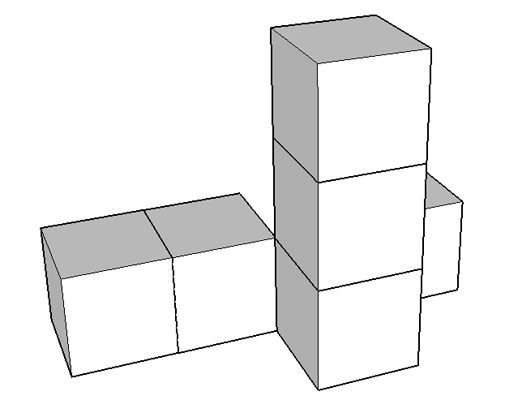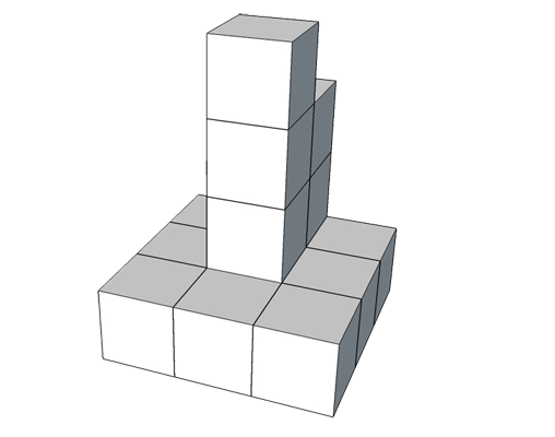 Rysunek obok pokazuje geometryczny efekt końcowy - konstrukcja zostaje obudowana klockami tak, że otrzymujemy sześcian i jest to najmniejszy z możliwych sześcianów zawierający tę konstrukcję.