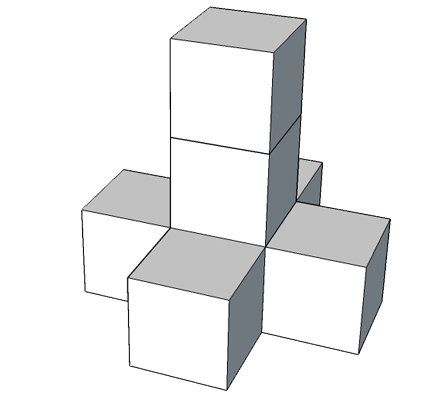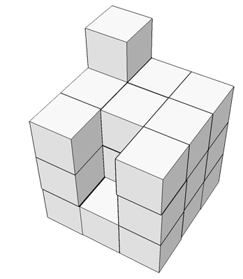 Konstrukcja składa się z takich samych sześciennych klocków o krawędzi 1 cm. Ile trzeba dołożyć takich klocków, aby powstał najmniejszy z możliwych sześcian zawierający w sobie całą tę konstrukcję?