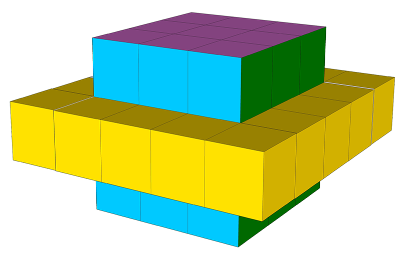 Aby móc sobie to lepiej wyobrazić, zobacz poniżej jak to wyglada w interaktywnym 3D - obracaj, przybliżaj, a prawym klawiszem myszki przesuwaj (kostka jest w jednym kolorze aby nie rozpraszać mózgu, wystające odcinki pozwolą na lepszą orientację przy obrotach bryły, a lekkie odstępy pomiędzy kostkami pozwolą lepiej widzieć 3D).