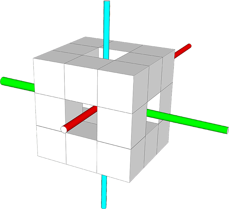 W sześcianie 3cm x 3 cm x 3cm (podobnym do kostki Rubika), usunięto z każdej ściany środkową kostkę, a także kostkę z samego środka sześcianu (mówiąc obrazowo - usunięto środkowe kostki "na wylot" - na rysunku trzy pręty symbolizują sytuację, że "przez środek nic nie ma").