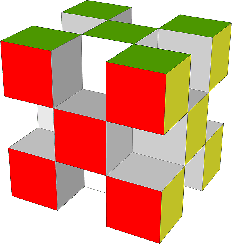 Aby móc sobie to lepiej wyobrazić, zobacz poniżej jak to wyglada w interaktywnym 3D - obracaj, przybliżaj, a prawym klawiszem myszki przesuwaj (wszystkie klocki są w jednym kolorze aby nie rozpraszać mózgu, wystające odcinki pozwolą na lepszą orientację przy obrotach bryły, a lekkie odstępy pomiędzy kostkami pozwolą lepiej widzieć 3D).