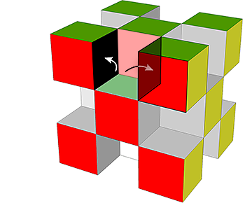Po usunięciu kostki ze środka krawędzi, powstaje "wnęka" mająca 4 ścianki (kwadraty po 1 cm2), przy czym jak pokazują to rysunki po prawej, dwa z tych kwadratów to kwadraty ze ścian bocznych (czerwony i zielony) "przesunięte równolegle do wnęki".