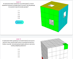 Niezwykle popularny rodzaj zadań, które nie wymagają skomplikowanych obliczeń, ale za to mocno sprawdzają wyobraźnię przestrzenną rozwiązującego. Najczęściej dotyczą sześcianów, w których usunięto lub dodano "klocki" jednostkowe, a pytania zazwyczaj dotyczą objętości i pola powierzchni całkowitej "nowej" bryły.