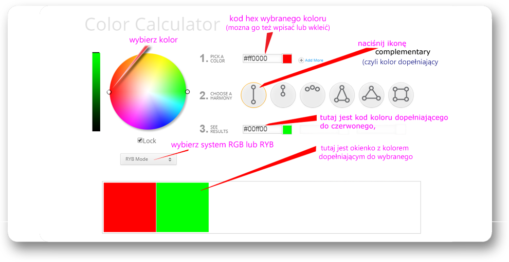 Sprawdź to w podanej niżej aplikacji, ustawiając suwaki na odpowiednią ilość czerwonego, zielonego i niebieskiego, a w prostokącie zobaczysz kolor wyjściowy.