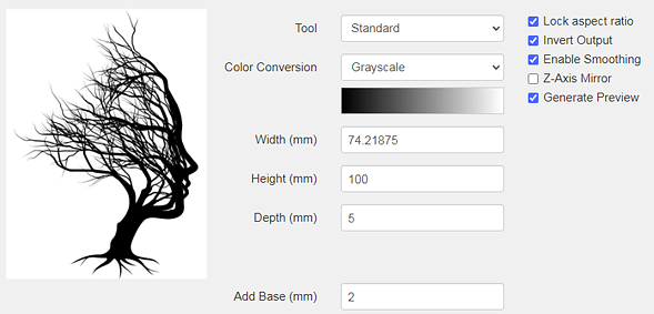 Invert Output - jeśli zaklikane, to nasz obraz będzie "wystawał" ponad podstawę, to on będzie pokrywany farbą i odbijany na papierze, a jeśli nie zaznaczymy Invert, to wszystko będzie później czarne, a nasz obraz będzie wgłębieniem, który na odbitce zostawi biały papier,
