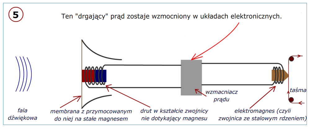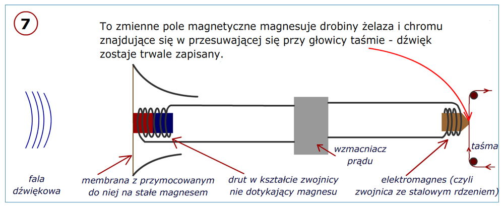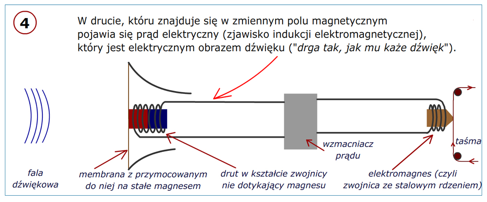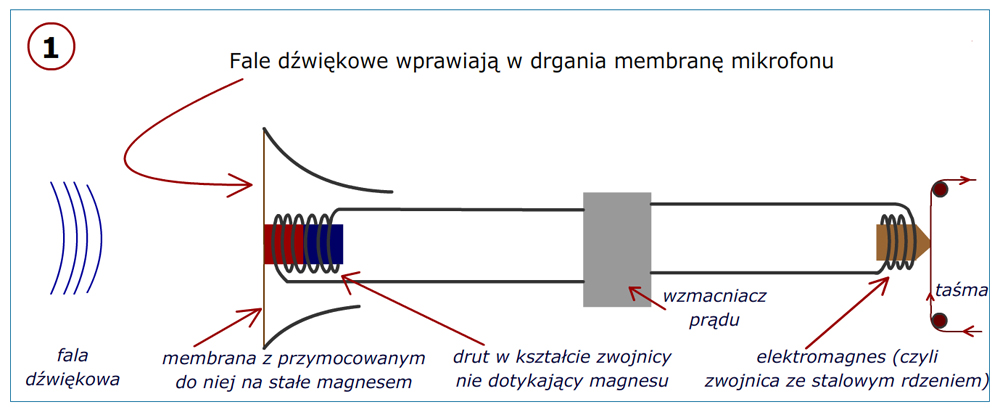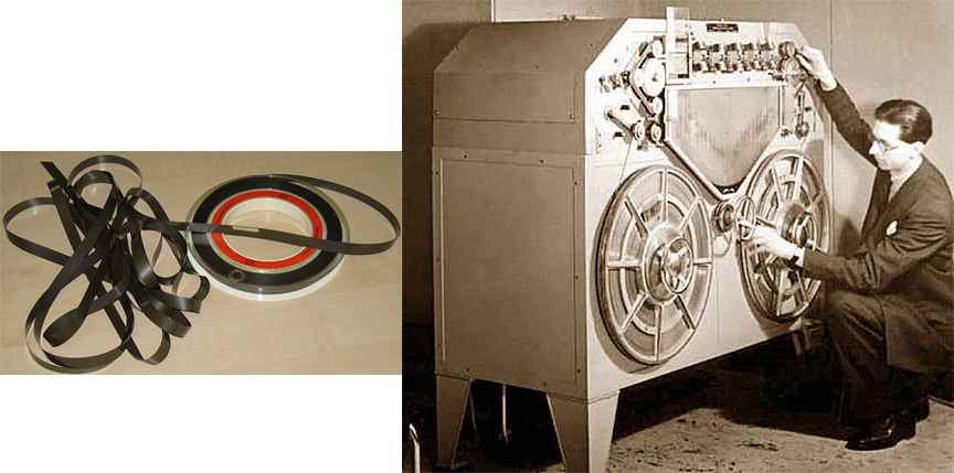 W roku 1935 opracowano taśmę papierową z napyloną na niej warstwą tlenków żelaza lub chromu, która mogła być magesowana głowicą magnetofonu. W późniejszych latach papier zastąpiono tworzywem sztucznym. Prawe zdjęcie przedstawia magnetofon firmy AEG z 1935 roku, w którym właśnie zastosowano taśmę magnetyczną zamiast drutu stalowego. (źródło: wynalazki. ...)