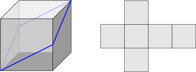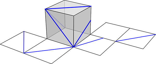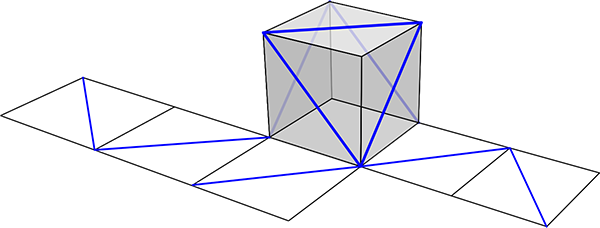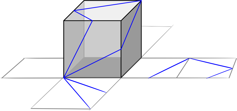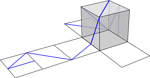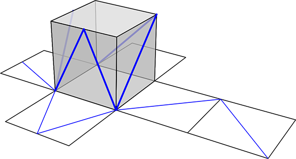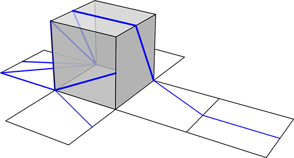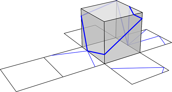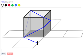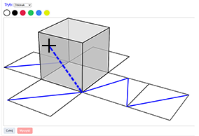 Narysuj na siatce sześcianu odcinki, które odpowiadają niebieskim odcinkom z powierzchni sześcianu.