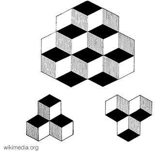 Kłopot z tym sposobem polega na tym, że jego użycie powoduje najczęściej więcej problemów jak samo zadanie - musimy dorysować na siatce sześcian widziany z góry (trzeba go trochę odchylić, aby cokolwiek zobaczyć). Odcinki (często niestarannie dorysowane) powodują mętlik w głowie i jeszcze bardziej komplikują rozwiązywanie. Nie na darmo sześcian jest często wykorzystywany w iluzjach graficznych, gdzie mózg ma kłopot z jego przestrzennym umiejscowieniem (zobacz poniżej - Ty jak widzisz sześciany: z góry czy z dołu?)