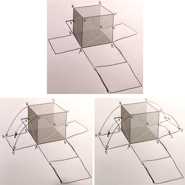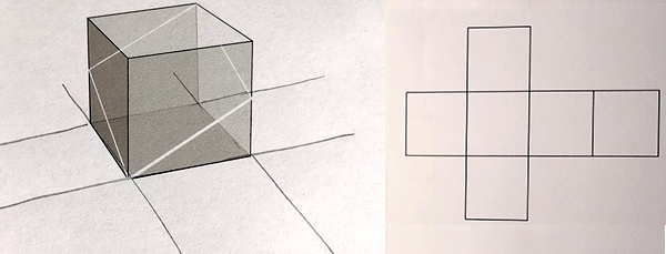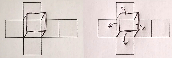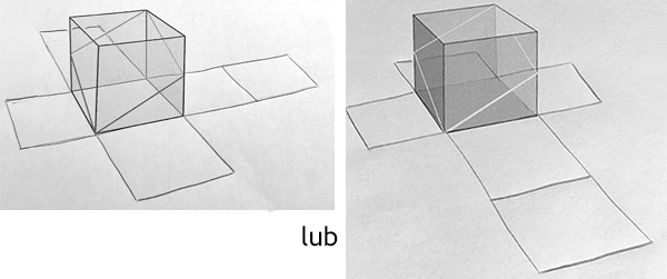 To chyba najsensowniejszy sposób pomagający powiązać sześcian z jego siatką. Trzeba pod sześcianem dorysować podaną siatkę - oczywiście musimy ją nieco przekrzywić aby dopasowała się wizualnie do sześcianu. Nie jest to trudne, bo wystarczy przedłużyć dolne krawędzie sześcianu, a potem uzupełnić resztę siatki, nie przejmując się niedoskonałościami ręcznych szkiców.