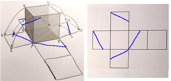 Teraz łatwiej przenieść na siatkę poszczególne białe odcinki, ale jeśli nadal wyobraźnia płata figle, to można podpisać kluczowe punkty na sześcianie i rysując odręczne łuki zobaczyć gdzie trafią po rozłożeniu sześcianu.