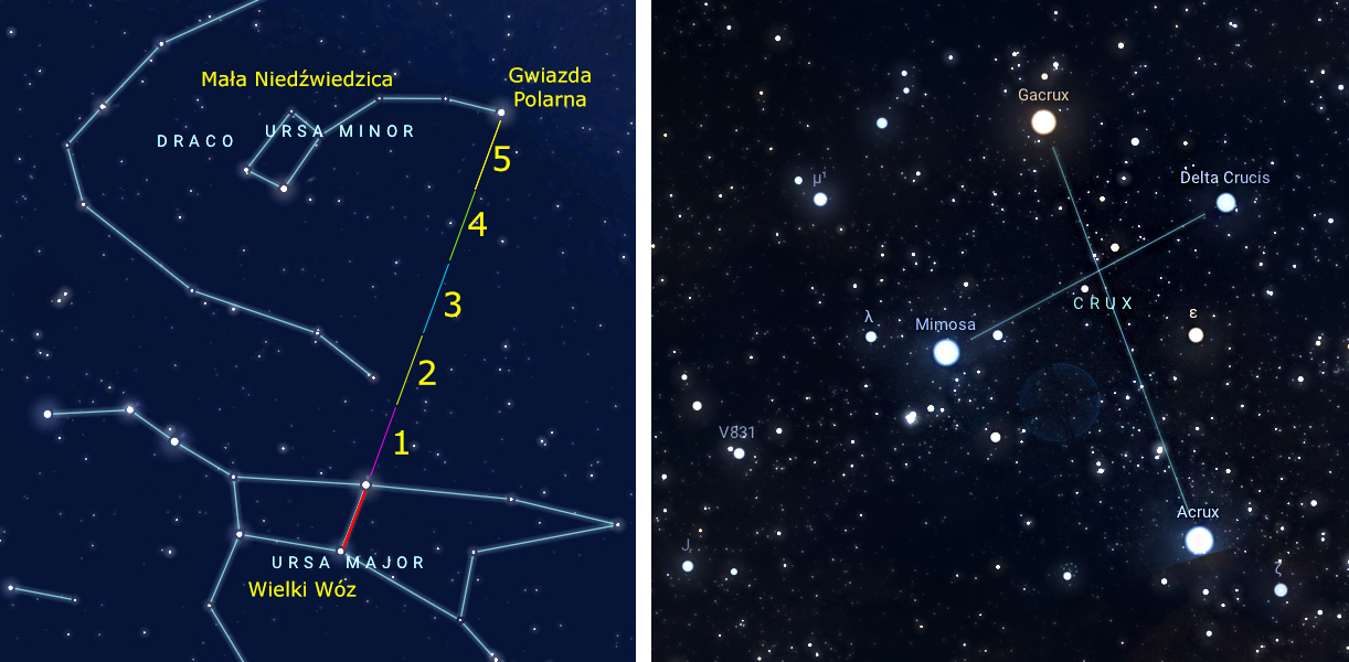 Ale Gwiazdy Polarnej nie widać z półkuli południowej i trzeba tam sięgnąć po inny gwiazdozbiór, aby wyznaczyć kierunek południowy. Jest nim Krzyż Południa (drugi obrazek po prawej).