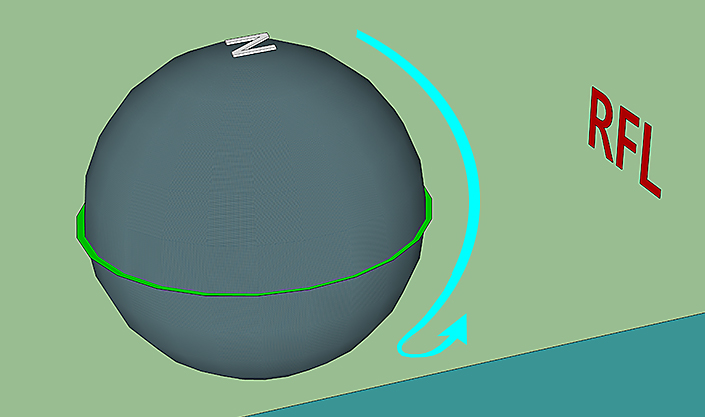 Ta sama historia, ale w otoczeniu Ziemi. Przemieszczamy się z półkuli północnej na południową pod napisem "RFL", a na końcu odwracamy się o 180°.
