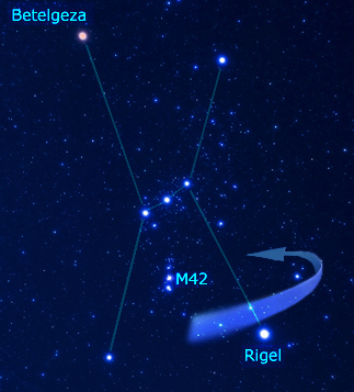 Bohaterem tego tematu jest Orion - jeden z najbardziej charakterystycznych gwiazdozbiorów zimowego nieba. Pierwsze co widać to cztery gwiazdy narożne i Pas Oriona - trzy gwiazdy w środku, leżące "w jednej linii". W "narożnikach" są jedne z najjaśniejszych gwiazd nieba - Rigel, i lekko czerwonawa Betelgeza, która "wkrótce" wybuchnie jako supernowa stając się widoczną w dzień (spokojnie, nic nam nie grozi). Poniżej pasa Oriona widać grupę gwiazd, a wśród nich rozmytą plamkę - to Wielka Mgławica w Orionie (M42).