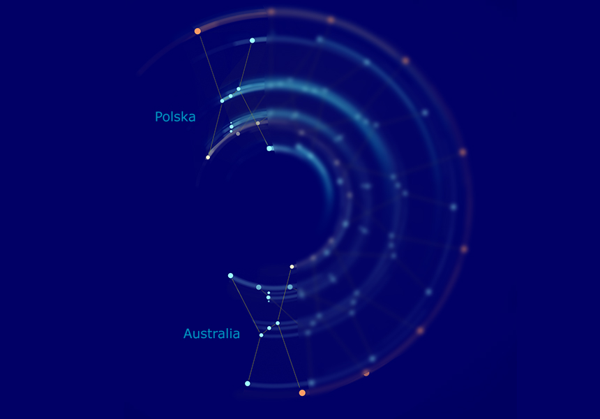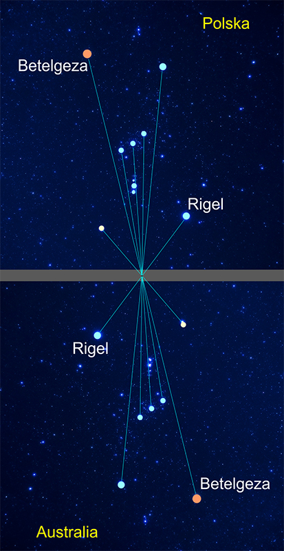 W animacji przemieszczamy się pomiędzy Polską a Australią z kamerą ustawioną na Oriona i obrotem o 180° po minięciu równika.