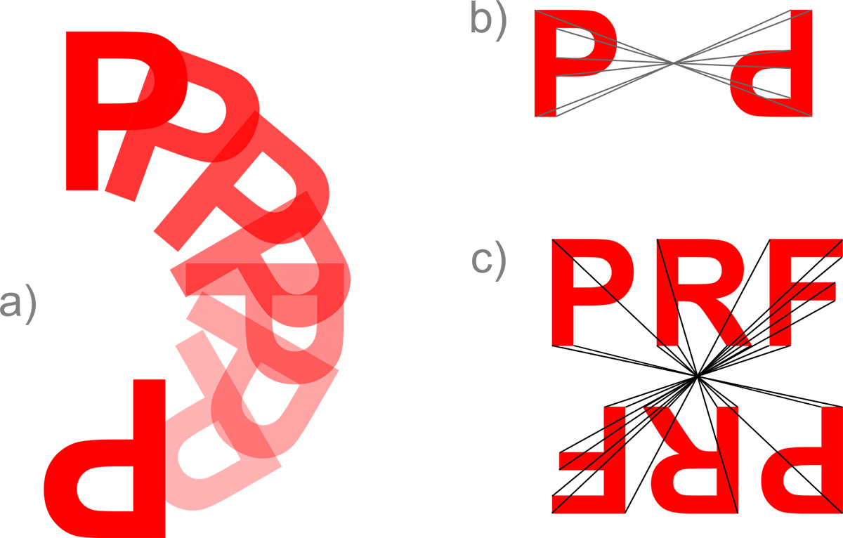 W zasadzie już ten pierwszy wyjaśnia istotę: przechodzimy z punktu N do S pod napisem "PFR", po czym obracamy się o 180°. Dlaczego "PFR"? Bo te litery nie mają wewnętrznej symetrii i dobrze nadają się do ilustracji wszelkich przekształceń.