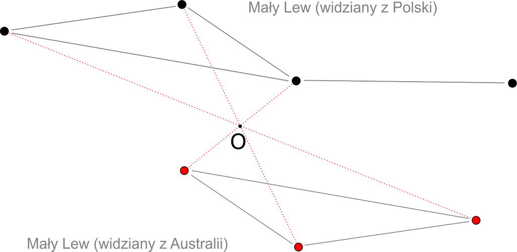 Tak więc obrót o 180° lub inaczej symetria środkowa, odpowiadają za "różne" obrazy tych samych gwiazdozbiorów oglądanych z półkuli północnej i południowej. Musimy tu dodać, że lekko "naciągamy" sytuację, gdyż nie chodzi o to, aby jednocześnie patrzeć z obu półkul na ten sam gwiazdozbiór, co było by trudne lub często niemożliwe - np. kiedy w Polsce oglądamy na wieczornym, styczniowym niebie Oriona, to w Sydney jest świt i nie tylko, że prawie nie widać już gwiazd, to i tak Orion zaszedł kilka godzin wcześniej. Chodzi o to, aby porównywać ten sam gwiazdozbiór widziany z obu półkul w "tej samej pozycji", czyli np. w sytuacji, gdy linia łącząca dwie wybrane gwiazdy gwiazdozbioru była w obu widokach pionowa i nie jest ważne, że pomiędzy taką sytuacją jest kilka czy kilkanaście godzin różnicy.