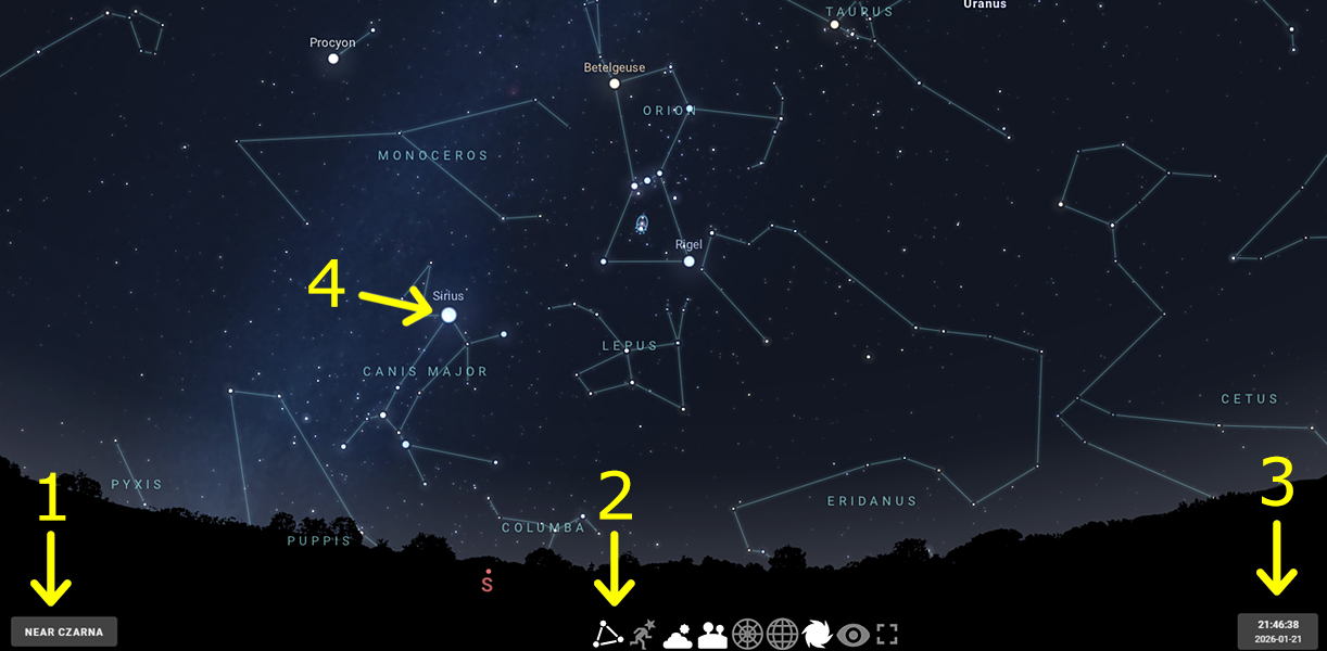 1 - ustawenie lokalizacji (z jakiego miejsca na Ziemi patrzymy w niebo),