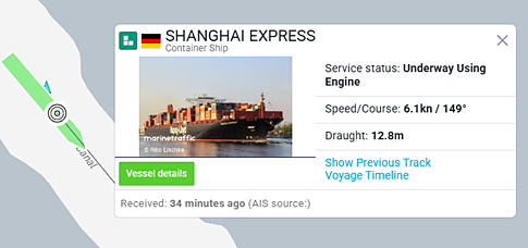 Po zbliżeniu na mapie danego statku (+/- na mapie lub kółko myszy) i kliknięciu na niego, otrzymamy podstawowe informacje, jak chociażby nazwa czy prędkość, ale kliknąwszy w zielony przycisk "Vessel details" otrzymamy masę informacji o statku, a także galerię jego zdjęć.