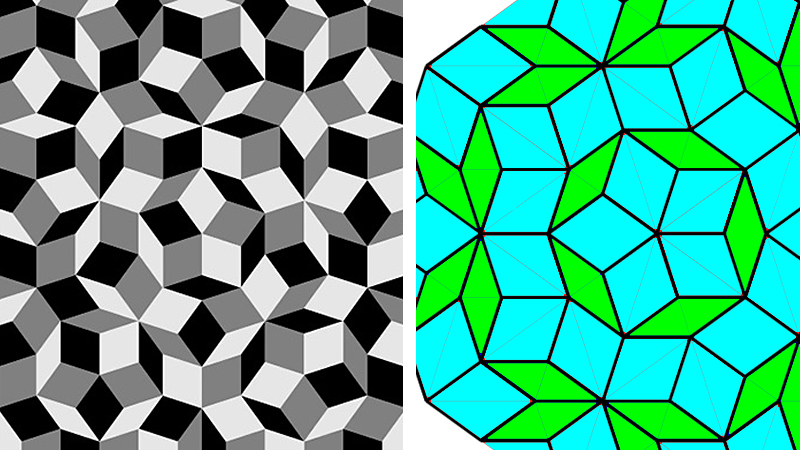 Kto wie, czy jeszcze nie bardziej znane dwie inne figury Penrose'a, czyli widoczne po prawej romby. Są często wykorzystywane ze wzgledu na efekt trójwymiarowości, który widzimy przy odpowiednim pokolorowaniu lub ułożeniu rombów.