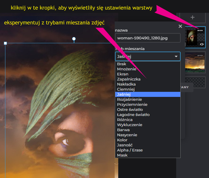 Po wywołaniu okienka ustawień warstwy, możemy rozpocząć eksperymentowanie z różnymi trybami wzajemnego mieszania się obu zdjęć.