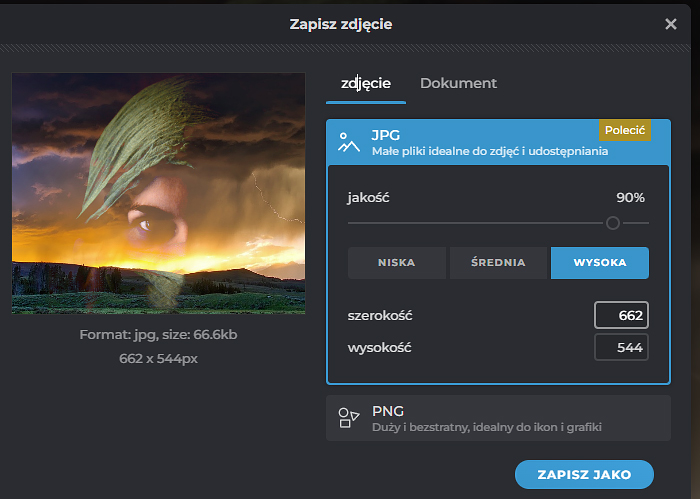 Klikając na dole strony Zapisz, możemy wybrać format (jpg, png, webp), a także ustawić jakość zapisu.