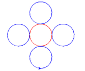Napisz program, który narysuje takie same pięć okręgów, przy czym jak widać, niebieskie są styczne do czerwonego. Wymiary i grubość pisaka dobierz sam (-a). Całość ma być widoczna w okienku programu.