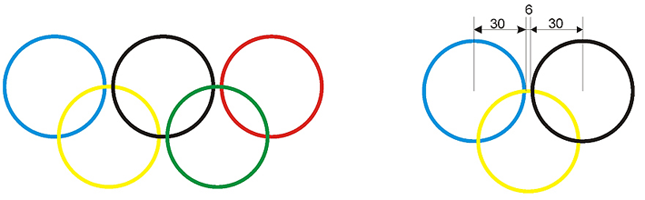 Napisz program, który narysuje okręgi z flagi olimpijskiej (bez tego skomplikowanego przeplatania). Wszystkie okręgi mają promień 30, a podany obok rysunek ułatwi ci ich precyzyjne rozmieszczenie. Wszystko ma być w całości widoczne w okienku programu.