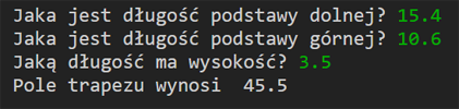 Napisz program, który obliczy pole trapezu, ale wcześniej zapyta jaka jest długość podstawy dolnej, górnej i wysokości.
