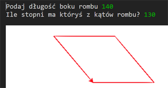 Napisz program, który narysuje romb, ale najpierw zapyta o długość boku i miarę jednego z kątów tego rombu.
