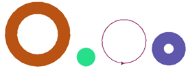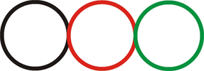 Napisz program, który narysuje takie same trzy styczne okręgi o promieniu 60, grubości 5 i kolorach takich, jak na rysunku. Wszystkie okręgi mają być w całości widoczne w oknie programu!